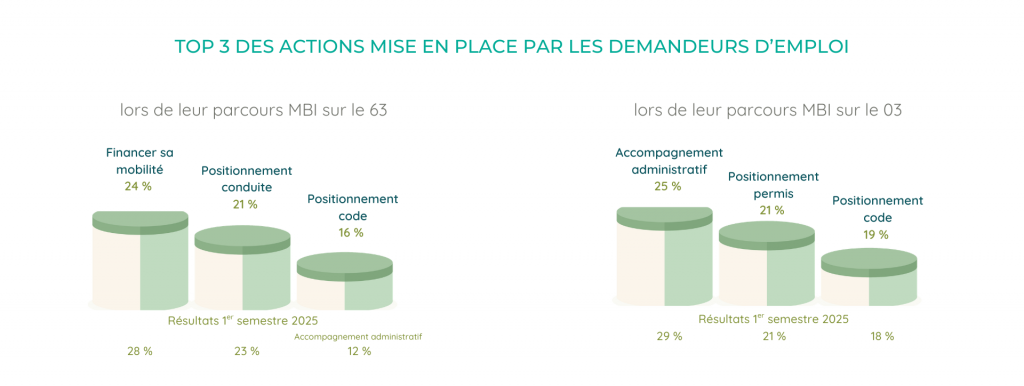 Parmi les actions mises en place, « Financer sa mobilité » domine dans le Puy-de-Dôme, tandis que l’accompagnement administratif arrive en tête dans l’Allier.